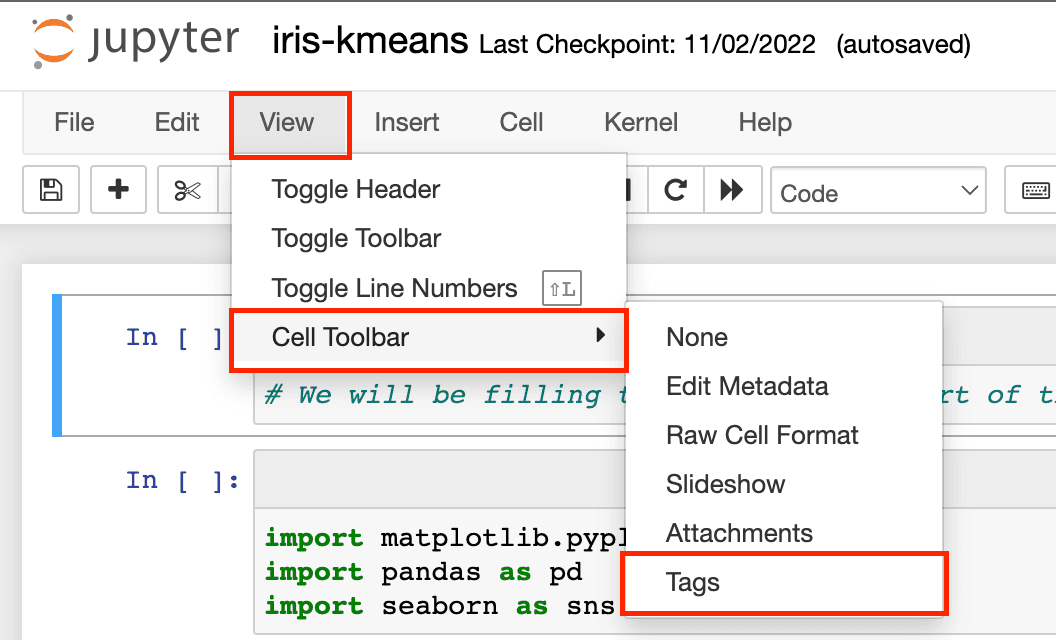 1. In Jupyter, navigate to View > Cell Toolbar > Tags: